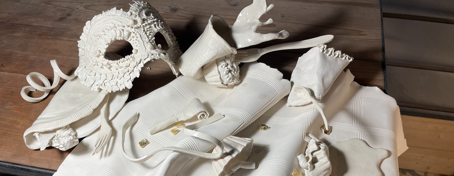 Artiste pluridisciplinaire, elle présente lors de son exposition “Éteindre les lampions” au centre d’art, des œuvres en céramique, ainsi que des dessins et des peintures sur tissu.