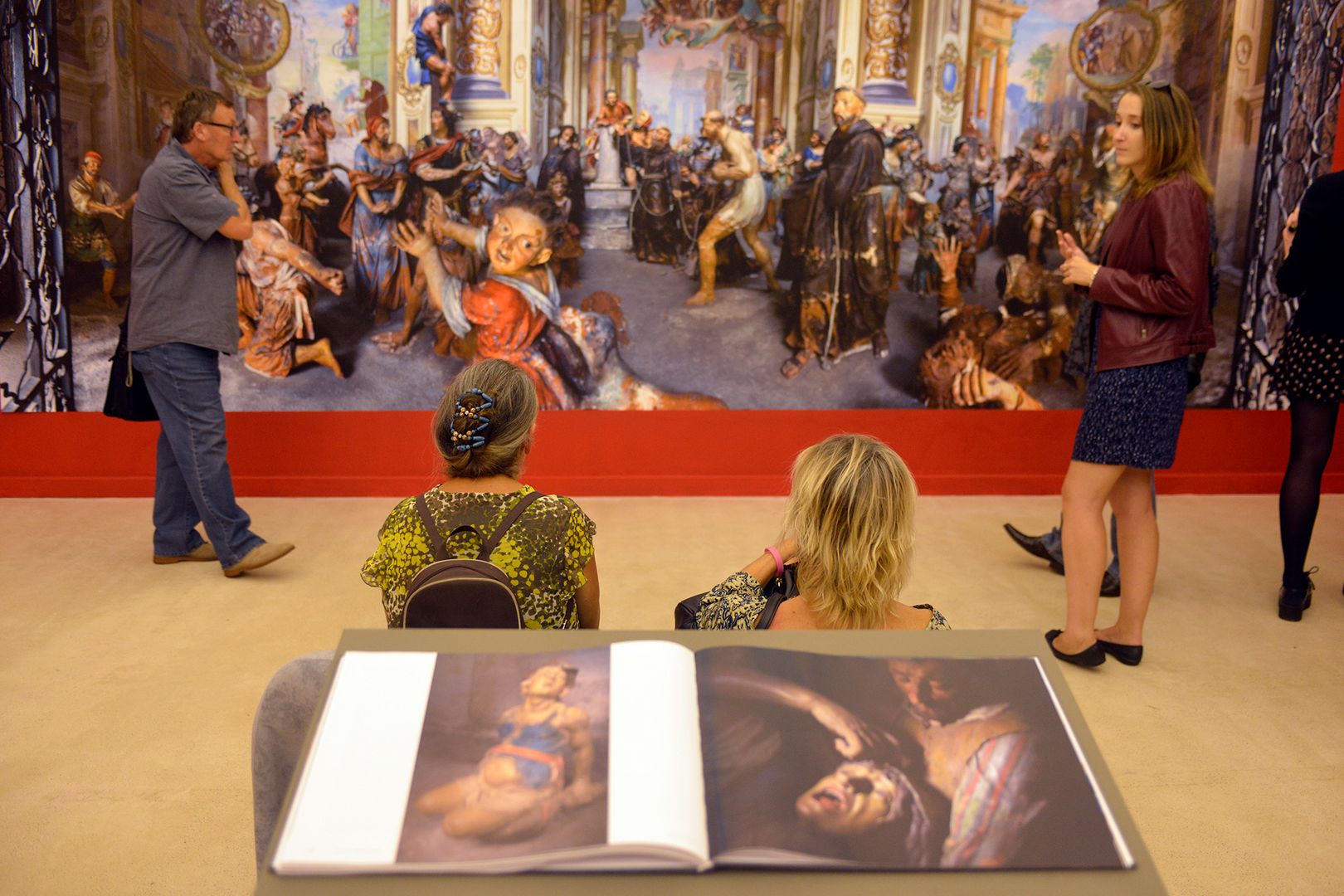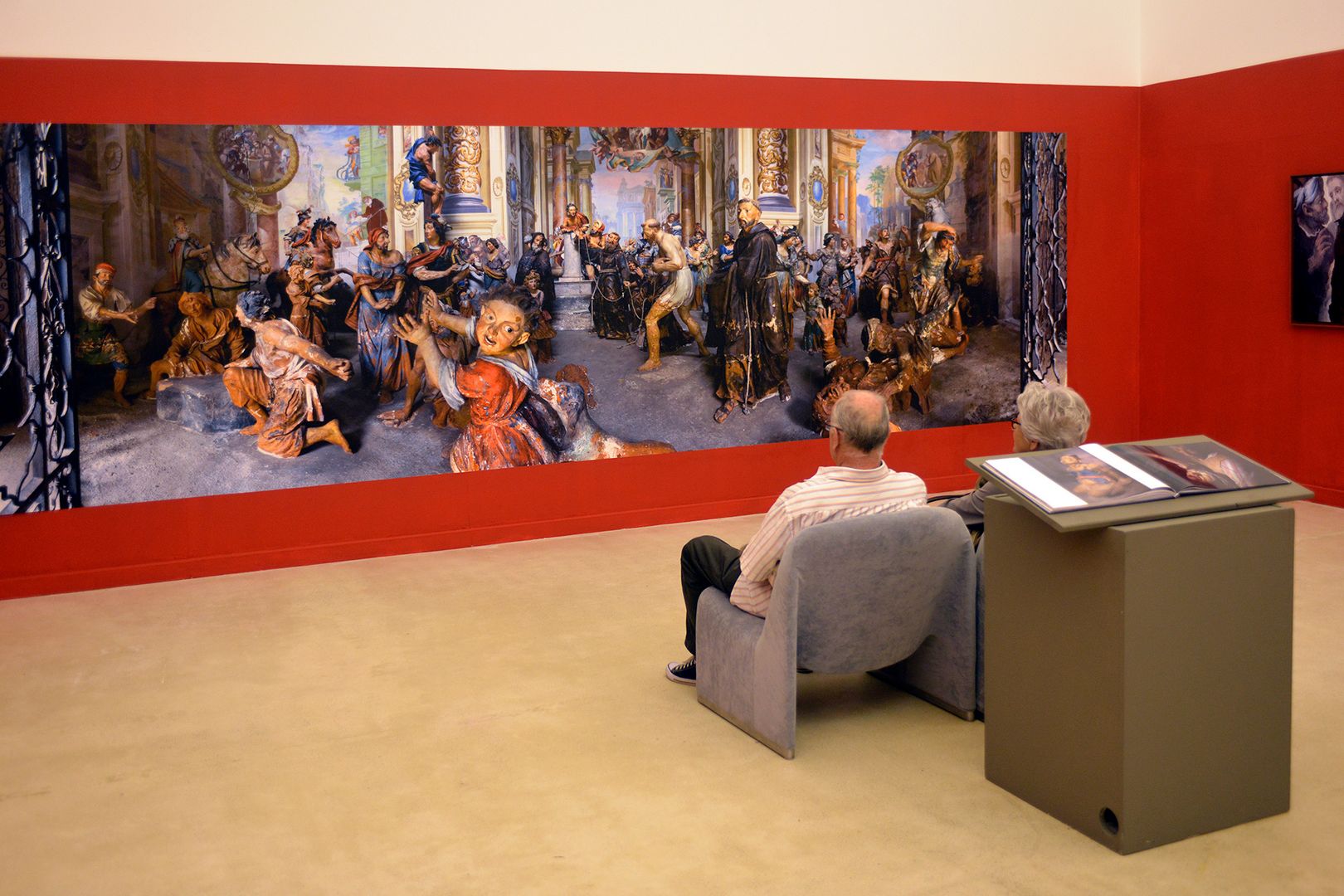 Le Centre d ‘art des Pénitents est divisé en 6 espaces, peints de différentes couleurs. Le rouge domine. Tout ce travail a été confié à la classe de 1ère année du BTS design graphique et numérique de l’école Saint-Joseph Les Maristes de Marseille. 25 jeunes très enthousiastes qui tracent des lignes, peignent des cloisons, réfléchissent ensemble à la manière de mettre en valeur les œuvres. Jean-Louis Garcin, le professeur, explique : « J’ai eu l’opportunité de leur faire rencontrer un projet, un artiste et surtout ils ont la possibilité de voir comment travailler dans l’espace. Christian Ramade est venu leur présenter son travail. Bernard Muntaner a lui aussi donné sa dimension et sa vision de l’aménagement de l’espace ». Ils ont travaillé au projet depuis la rentrée et maintenant place aux travaux pratiques. Charlotte, une des étudiantes, toute occupée à couvrir une cloison d’une belle couleur rouge, explique qu’ils ont chacun présenté un projet, qu’ils en ont discuté. Pour elle qui souhaiterait travailler dans une maison d’édition comme graphiste, cet exercice n’est vraiment pas inutile. « C’est une conduite de projet, il nous faut nous plonger dans la réalité. C’est la seule manière de prendre conscience des contraintes ».