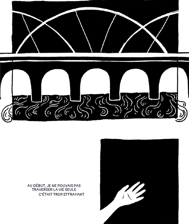 Dans son roman graphique, ses dessins se déploient en plusieurs formats. Uniquement en noir et blanc, les contrastes de ses dessins sont ceux de ses émotions. Les lignes y sont simples mais expressives, agrémentées de peu de mots pour transmettre son message et donc son histoire. Un dialogue entre la ligne graphique et la ligne d’écriture.